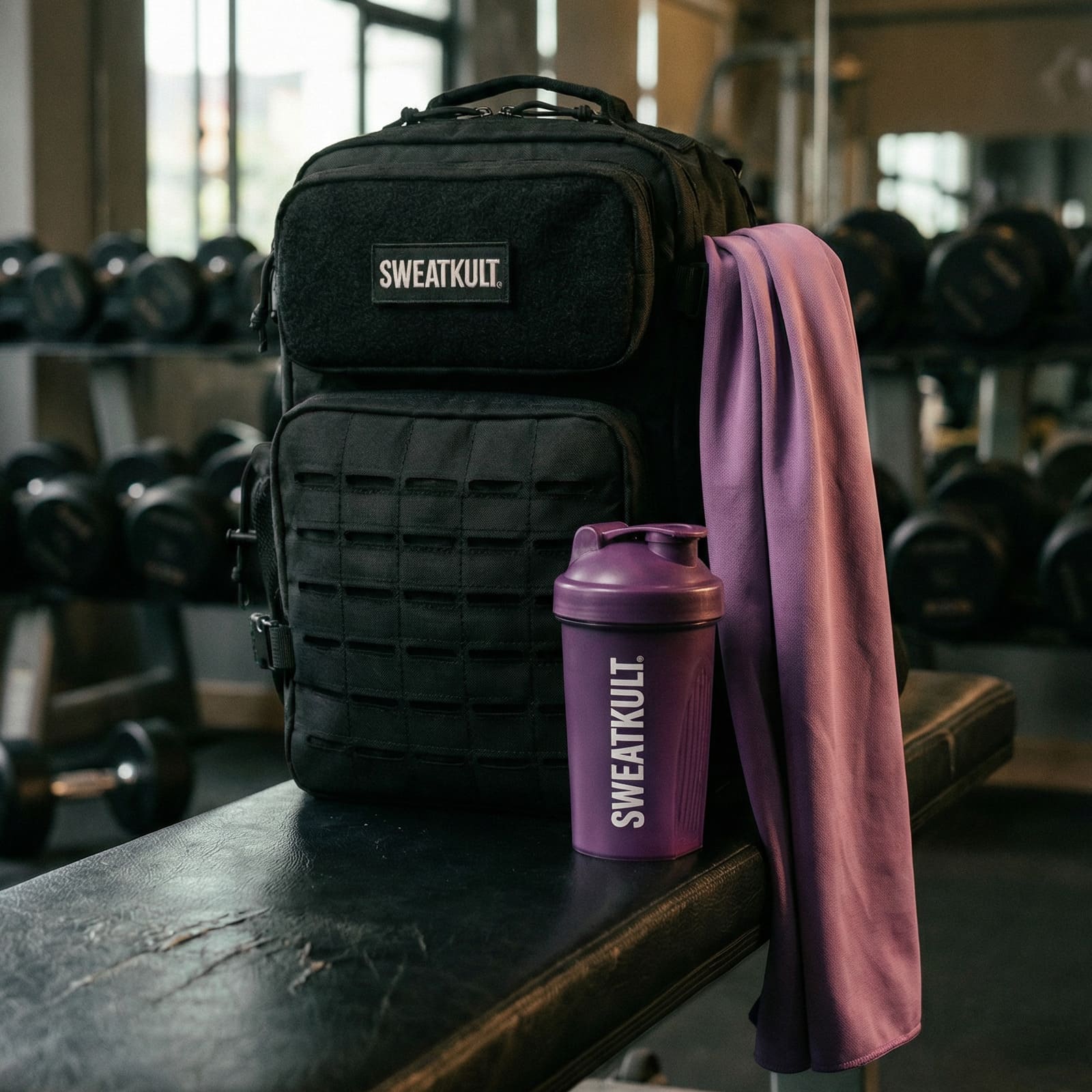 Your complete gym system. Tactical backpack + shaker + towel + training routines.